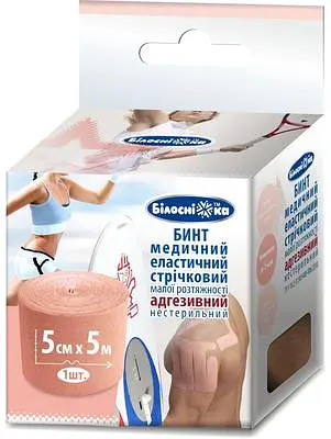 Бинт адгезивний еластичний Білосніжка - це еластична клейка стрічка, є ефективним засобом у запобіганні та лікуванні травм м'язів і зв'язок. Бинт розроблений з метою профілактики та природного прискорення процесу відновлення і реабілітації. Іноді даний бинт називають "спортивний тейп", sport tape, kinetic tape або "еластичний пластир".