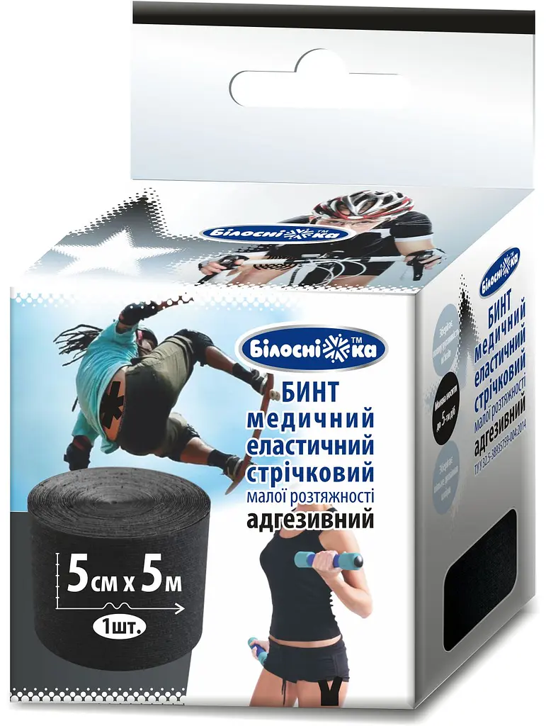 Бинт адгезивний еластичний Білосніжка - це еластична клейка стрічка, є ефективним засобом у запобіганні та лікуванні травм м'язів і зв'язок. Бинт розроблений з метою профілактики та природного прискорення процесу відновлення і реабілітації. Іноді даний бинт називають "спортивний тейп", sport tape, kinetic tape або "еластичний пластир".