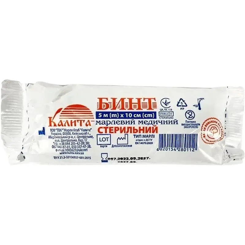 Бинт марлевий медичний стерильний для перев'язок, фіксації тампонів з вати та інших медичних виробів.