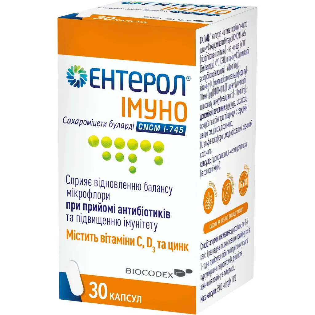 Пробіотик Biocodex Ентерол Імуно рекомендований як додаткове джерело вітамінів С, D, та цинку. Сприяє відновленню балансу мікрофлори кишківника, зокрема при його порушенні внаслідок лікування антибіотиками; сприяє підвищенню імунітету та опірності організму до інфекцій. Має антиоксидантні та антитоксичні властивості.