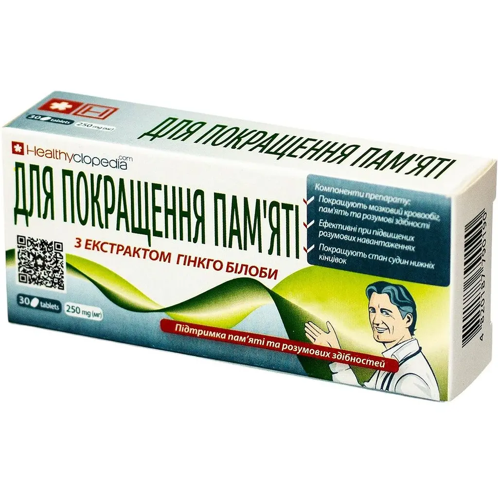 Дієтична добавка Healthyclopedia Для покращення пам'яті - це комплекс компонентів, необхідних для щоденної підтримки таких важливих функцій організму, як пам'ять, розумові та пізнавальні здібності та профілактики порушень центрального та периферичного кровообігу. Комплекс складається з надзвичайно важливих вітамінів для нервової та судинної систем і рослинного екстракту з доведеною ефективністю щодо профілактики та відновлення функцій мозку та периферичних судин. Компоненти препарату виявляють ангіопротекторну, антиоксидантну, протинабрякову, антигіпоксичну та дезінтоксикаційну дії.