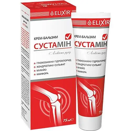 Ефективність крем-бальзаму Elixir Сустамін визначається наявністю в складі біологічно активних компонентів: глюкозаміну гідрохлориду, календули, хондроїтину сульфату, екстрактів сабельника, звіробою, живокосту, чистотілу, ромашки, мумійо, метилсульфонілметану, камфори.