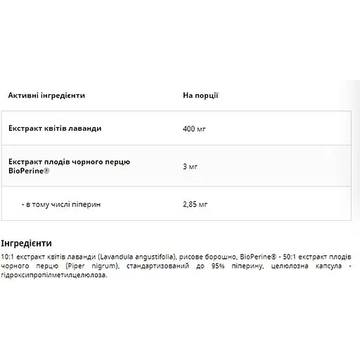 UNS Lavender Kwiat + BioPerine - це дієтична добавка, яка містить 400 мг екстракту квітки лаванди та 3 мг екстракту чорного перцю в кожній капсулі. Лаванда сприяє розслабленню, допомагає підтримувати здоровий сон і може заспокоїти проблеми з травленням. Додавання BioPerine підвищує біодоступність активних інгредієнтів, покращуючи їх ефективність.