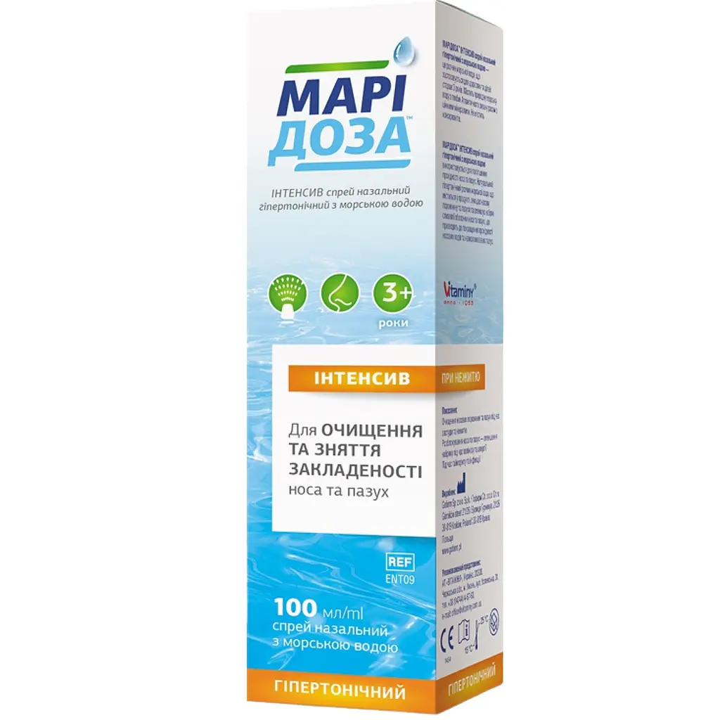 Марідоза Інтенсив спрей назальний гіпертонічний з морською водою використовується для поліпшення прохідності носових ходів та пазух. Очищає носову порожнину та пазухи, зменшує набряк слизової оболонки носа та пазух, що сприяє поліпшенню носового дихання. Рекомендується при закладеності носа та нежитю, спричинених інфекцією, синуситом або алергією.