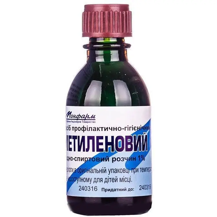 Розчин водно-спиртової метиленовий синій 1% відноситься до антисептичних засобів-барвників. В основі механізму антисептичної дії метиленового синього лежить його властивість реагувати з певними кислими або основними групами речовин грампозитивних бактеріальних клітин, з мукополісахаридів і білками з утворенням малорозчинних і повільно іонізуючих комплексів.
