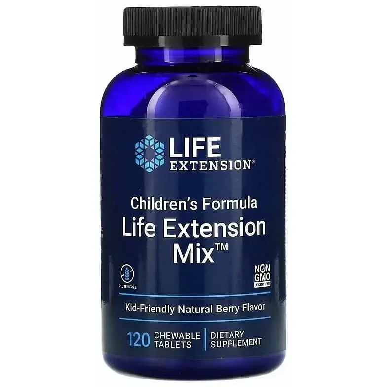 Children's Formula Mix Life Extension - це продукт, котрий складається з повного спектру вітамінів, яких потребує щодня організм дитини для повноцінного росту і розвитку. Прийом цих мультивітамінів поповнить організм малюка денною нормою всіх необхідних йому речовин. Таку кількість, що містить 1 жувальна таблетка, можна отримати тільки випивши концентрат вітамінів і мінералів з фруктів і овочів, що має гіркий смак і який не припаде до душі не тільки малюкові, а навіть дорослому.