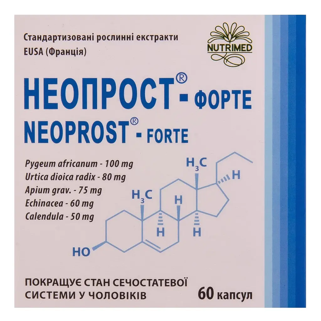 Неопрост – форте рекомендований як додаткове джерело сапонінів, фітостеролів та інших біологічно активних речовин з метою покращення функціонального стану сечостатевої системи у чоловіків; сприяє зменшенню запальних процесів у передміхуровій залозі при простатиті, полегшує сечовиділення, поліпшує загальний стан та покращує якість життя у чоловіків при доброякісній гіперплазії передміхурової залози за рахунок нормалізації її об’єму, що відбувається при гальмуванні розвитку гіперпроліферативних процесів.