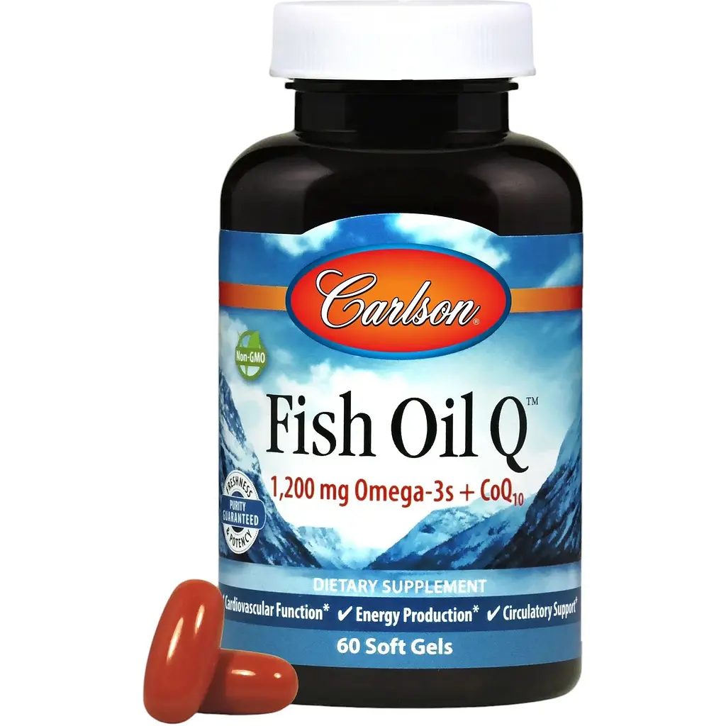 Fish Oil Q від Carlson поєднує в собі важливі омега-3 жирні кислоти EPA і DHA з коензимом Q10. EPA і DHA допомагають підтримувати серце сильним, здоровими кровоносні судини та кровообіг та еластичність артеріальної стінки. CoQ10 відіграє ключову роль у виробництві енергії в мітохондріях, електростанціях клітини. Це означає, що він важливий для кожної клітини в тілі а, отже, майже для кожної функції. CoQ10 також сприяє здоров’ю серцево-судинної системи.
