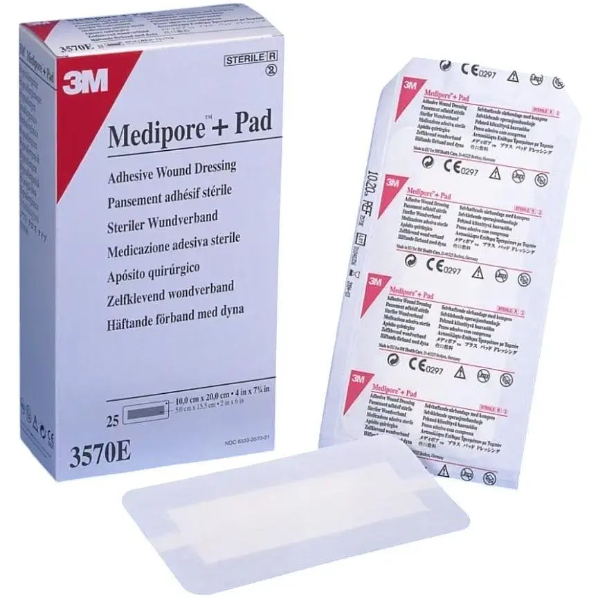 Адгезивна пов'язка 3M Mediporе+Pad має неткану еластичну пластирну основу з нанесеним гіпоалергенним водонепроникним клеєм і абсорбуючою прокладкою. Пов'язка має нанесений неприлипаючий до рани шар, що забезпечує її безболісне зняття. Вона не залишає клею на шкірі після зняття.