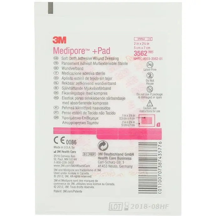 Адгезивна пов'язка 3M Mediporе+Pad має неткану еластичну пластирну основу з нанесеним гіпоалергенним водонепроникним клеєм і абсорбуючою прокладкою. Пов'язка має нанесений неприлипаючий до рани шар, що забезпечує її безболісне зняття. Вона не залишає клею на шкірі після зняття.