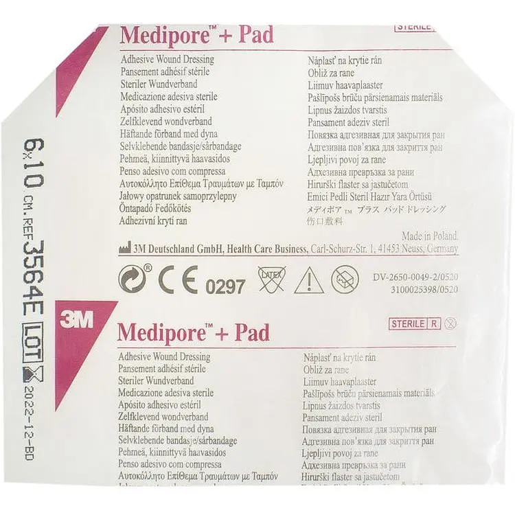 Адгезивна пов'язка 3M Mediporе+Pad розроблена для використання як механічний бар’єр та для поглинання ексудату для перев’язки гострих ран, таких як порізи, опіки, зсадини, місця введення внутрішньовенних катетерів та для закриття хірургічних розрізів.