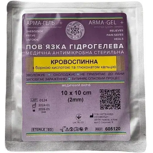Гідрогелева кровоспинна пов’язка АРМА-ГЕЛЬ+ з борною кислотою та глюконатом кальцію, 10×10 см