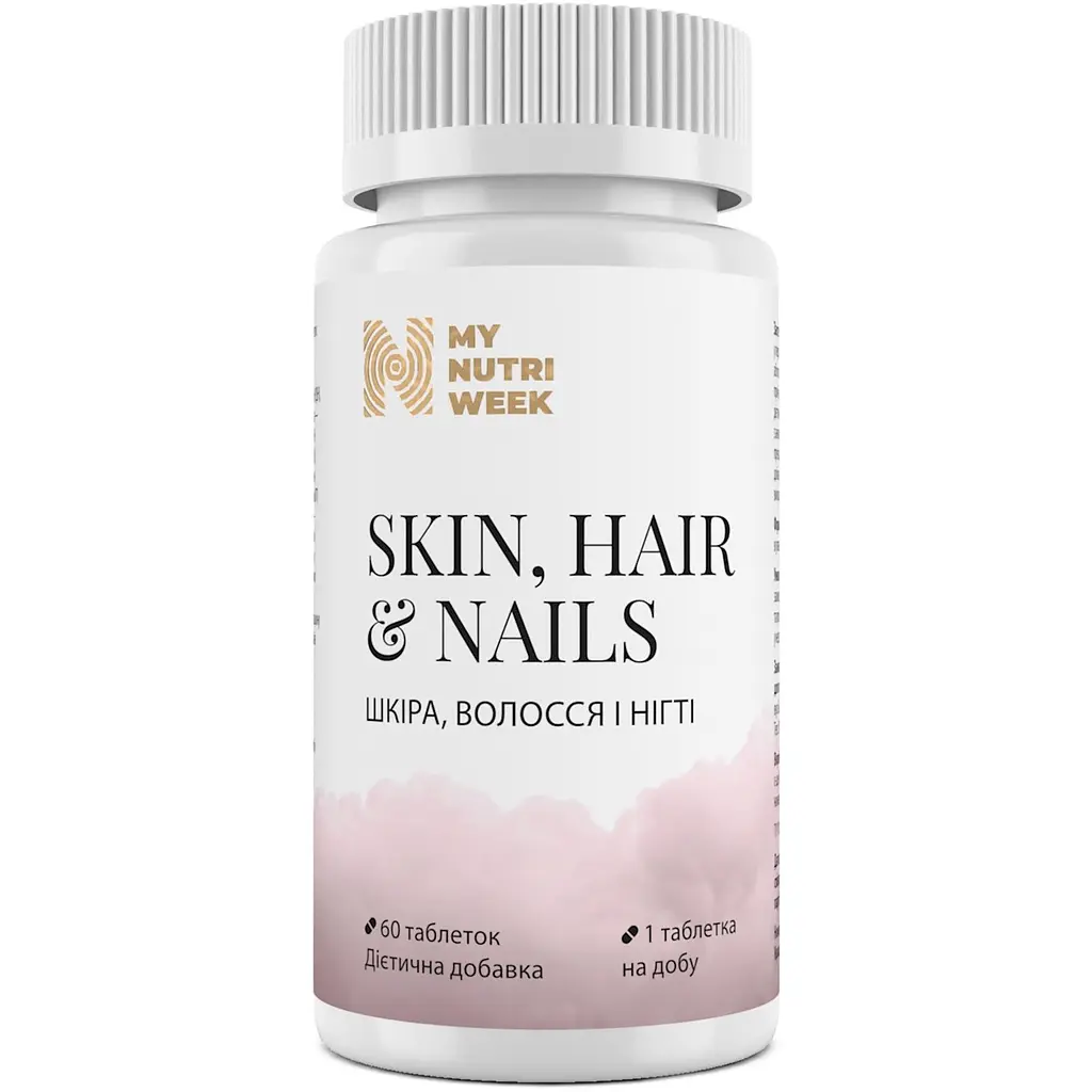 Skin, Hair & Nails від My Nutri Week – це комплекс амінокислот, вітамінів та мінералів, створений для підтримки здоров’я шкіри, волосся та нігтів. Формула поєднує будівельні нутрієнти для колагену, антиоксидантні фактори та мікроелементи, що беруть участь у кератинізації та пігментації.