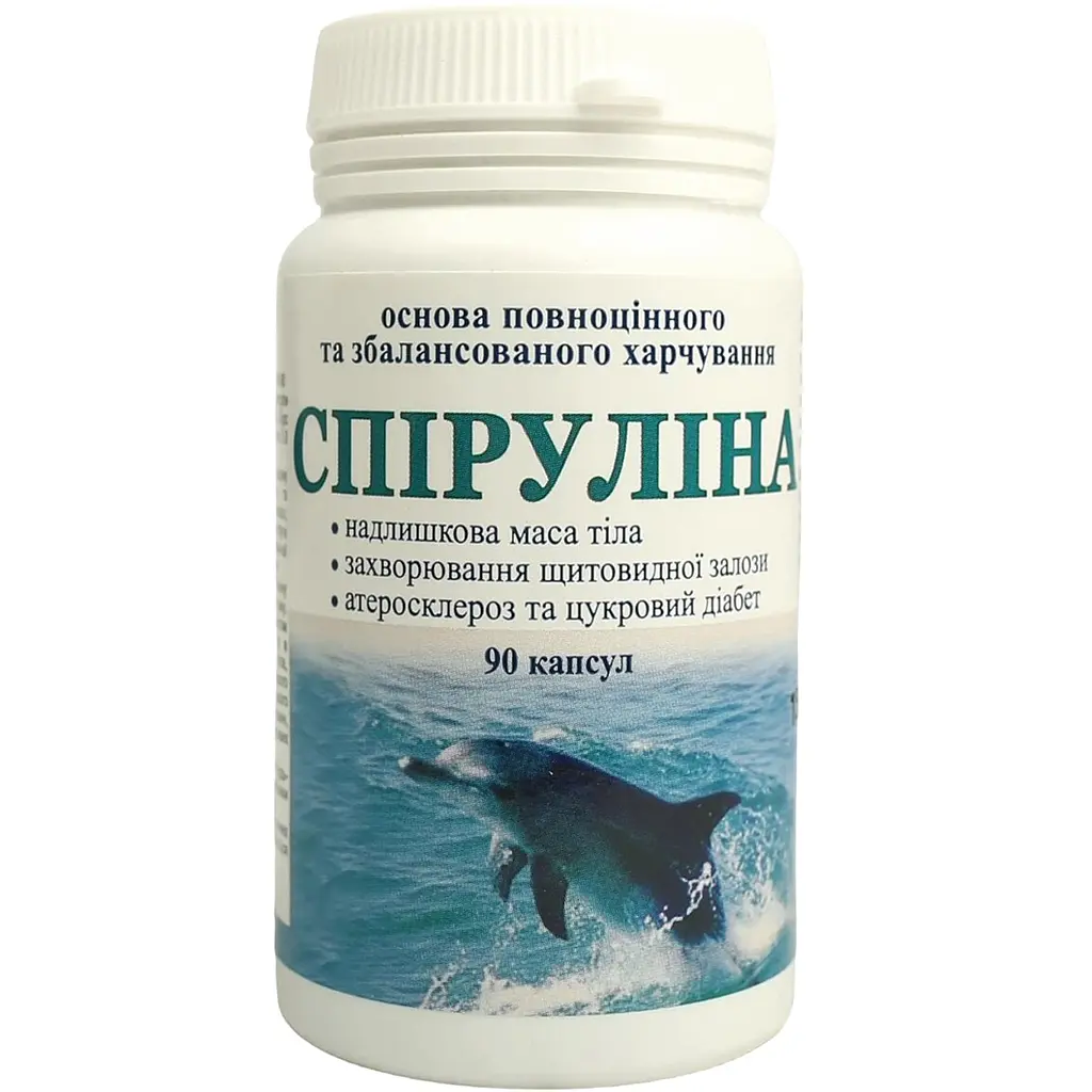 Продукт містить синьо-зелену водорость спіруліну, багату білком (до 70%), вітамінами (A, B12, E), залізом, фікоціанінами та амінокислотами, які сприяють антиоксидантному захисту, зміцненню імунітету та енергетичному обміну. Формула з 90 капсул у флаконі розрахована на тривалий курс прийому, забезпечуючи зручність використання.