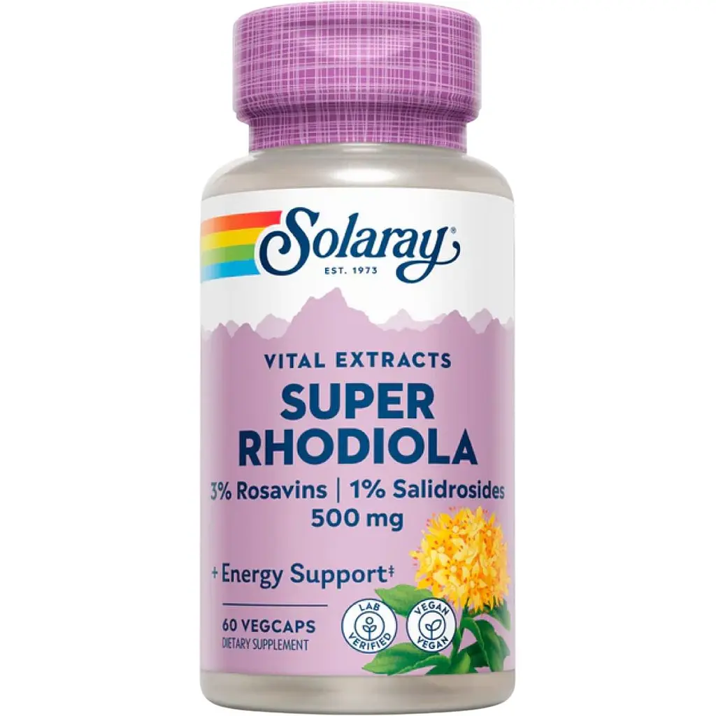 Родіола рожева у складі Solaray Super Rhodiola Root Extract - просто незамінний помічник у боротьбі з перевтомою, хронічною втомою, безсонням. Вона має омолоджувальну і загальнозміцнювальну дію, допомагаючи тканинам засвоювати кисень, сприяє клітинному обміну.