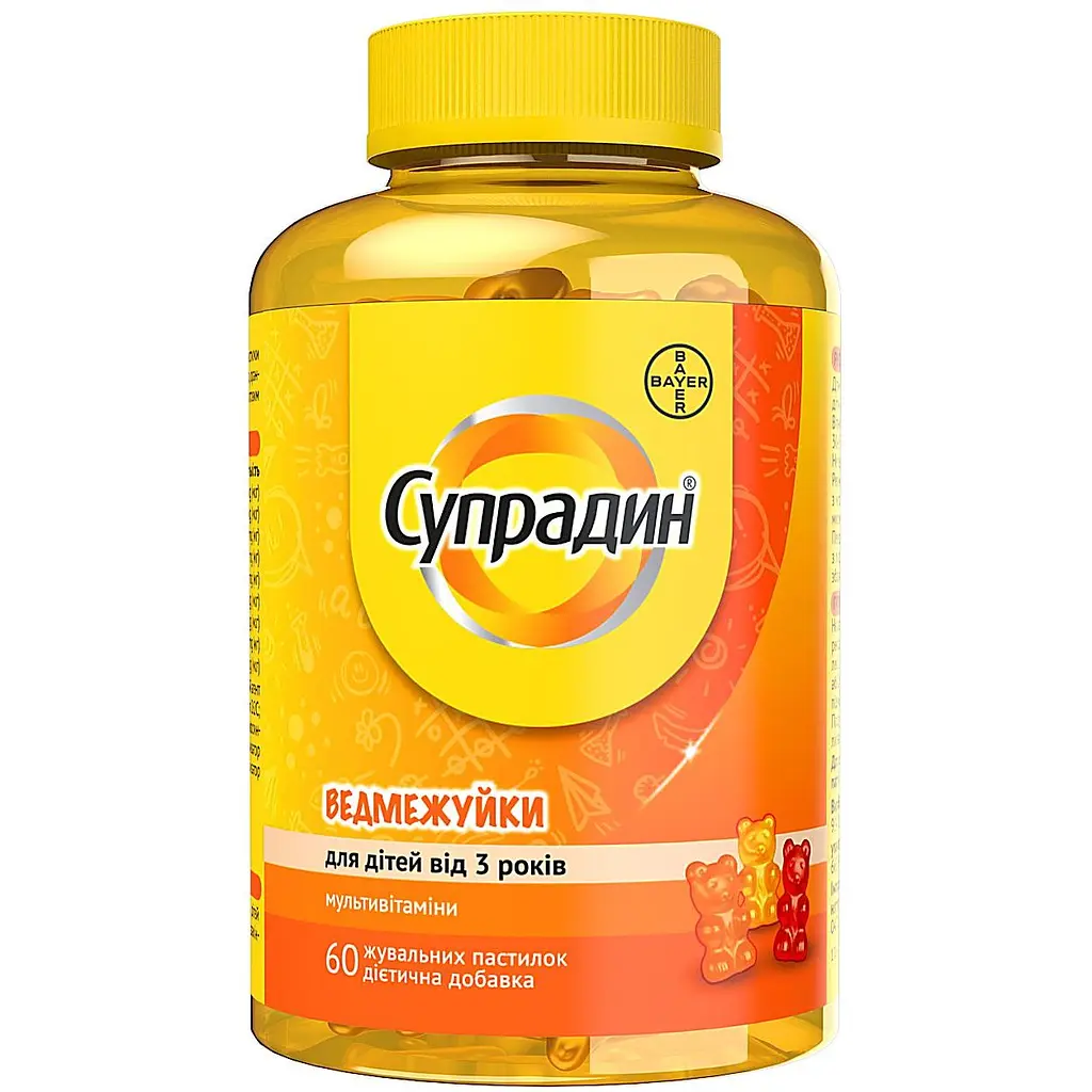 Дієтична добавка Супрадин® Ведмежуйки (маслянисті пастилки масою 4 g (г) невеликого розміру, різних кольорів (жовтого, оранжевого та червоного) у вигляді фігурок ведмедів з фруктовим смаком та запахом.). Не є лікарським засобом!