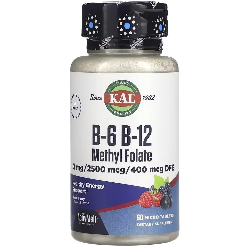 До кінця акції 4 дніKAL B-6 B-12 Methyl Folate - це препарат, призначений для підтримки серцево-судинної системи та енергетичного обміну. Містить вітаміни B6, B12 у формі метилкобаламіну та метилфолат, які відіграють ключову роль у метаболізмі та підтримці нормального рівня гомоцистеїну в крові.