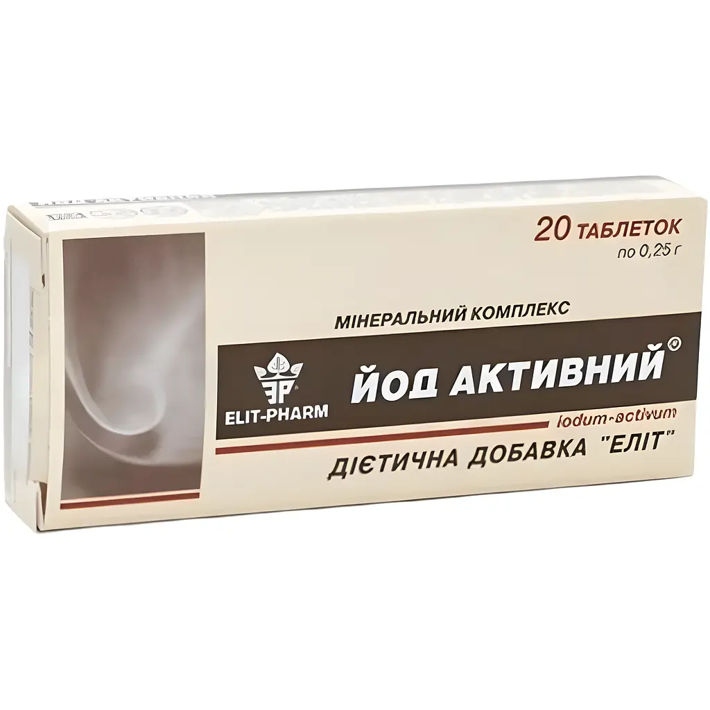 Одна таблетка дієтичної таблетки Йод активний Elit-Pharm містить 50 мкг йоду. Компонент може позитивно впливати на функціонування організму: