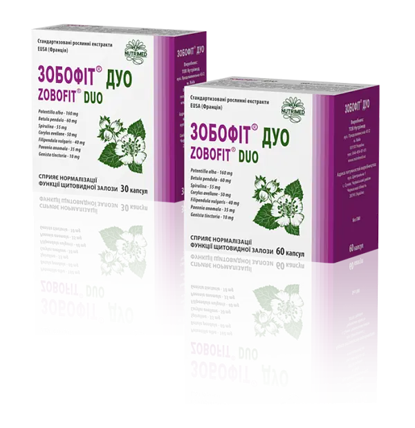 ЗОБОФІТ® ДУО рекомендований як додаткове джерело біологічно активних речовин рослинного походження для нормалізації функціонального стану щитовидної залози у осіб із порушеною її функцією (при гіпотиреозі, у т.ч. субклінічній формі, гіпертиреозі, аутоімунному тиреоїдиті, дифузному, вузловому та ендемічному зобі). ЗОБОФІТ® ДУО сприяє нормалізації об’єму, структури та рівня гормонів щитовидної залози, покращенню загального самопочуття та психоемоційного стану. Завдяки своєму складу ЗОБОФІТ® ДУО характеризується комплексною позитивною дією як на щитовидну залозу, так і на організм в цілому. Має тиреотропні, антипроліферативні, протизапальні, антиоксидантні та імуномодулюючі властивості.