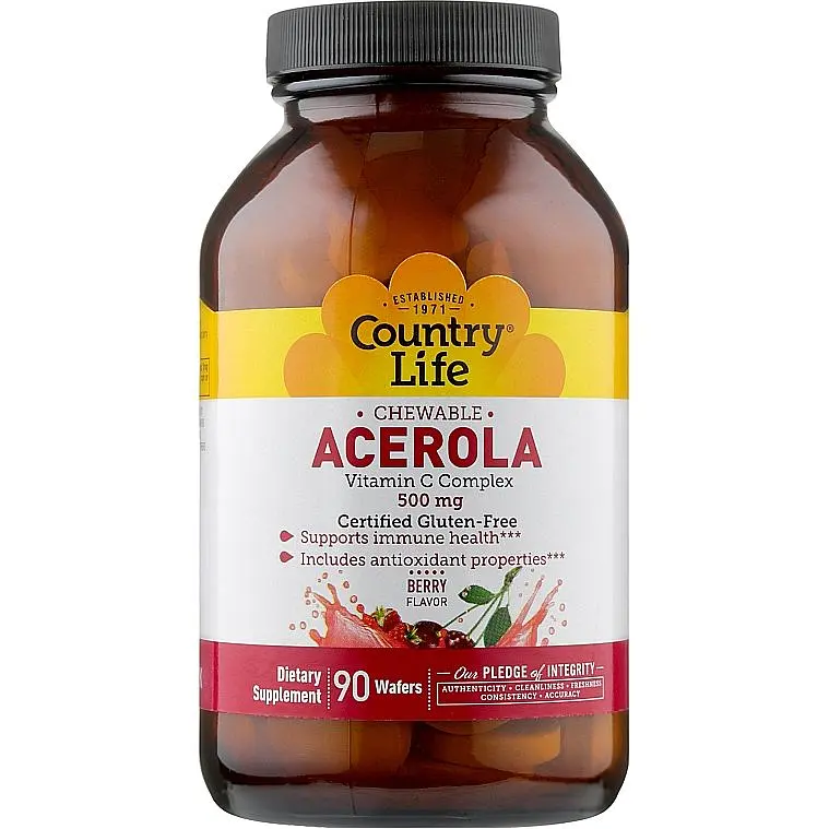 Диетическая добавка Ацерола витамин С производства Country Life (США) содержит очень важную для организма аскорбиновую кислоту, полученную из бивофлавонидов цитрусовых и экстракта ацеролы (барбадосской вишни). Плоды этих растений являются источником большого количества витаминов С и К. Прием данного препарата позволяет восполнить дефицит этих элементов, играющих ключевую роль в поддержании здоровья и активного образа жизни.