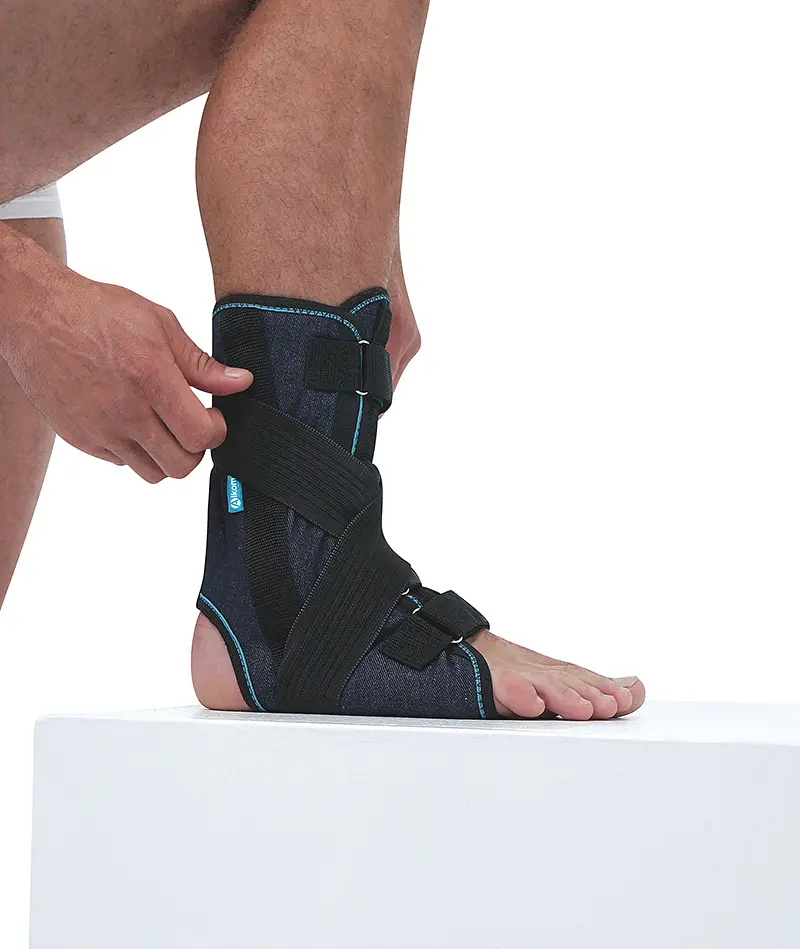 Ортез на голеностопный сустав обеспечивает сильную степень фиксации сустава и дает возможность передвигаться самостоятельно даже после серьезных повреждений голеней. Разъемная конструкция позволяет без дополнительного дискомфорта надевать ортез в случаях, когда набухшая нога после повреждения, в случае ограниченной подвижности сустава, при наличии лишнего веса. Алюминиевые ребра жесткости моделируются под конкретного пациента. Застежки-липучки позволяют удобно закреплять изделие на ноге. Дополнительный фиксатор в виде 8-образной повязки усиливает фиксацию (при необходимости).