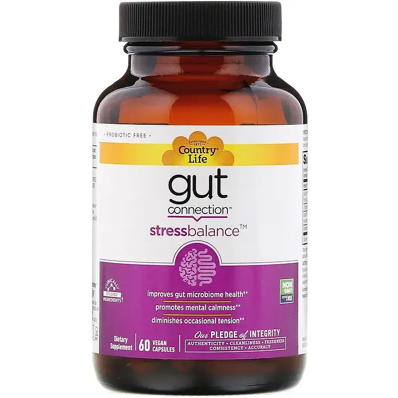 Натуральная добавка Country Life Gut Connection Stress Balance Gut Connection - пищевая добавка, поможет справиться со стрессом, напряжением и раздражительностью, которыми наполнена современная жизнь. В составе препарата продукт ферментации дрожжей для хорошего пищеварения, а также аминокислоты, способствующие выработке гормонов, важных для правильной работы нервной системы, улучшающие работу мозга, способствующие повышению стрессоустойчивости. Эффективность препарата основана на сбалансированности всех ингредиентов по принципу взаимосвязи всех систем организма.