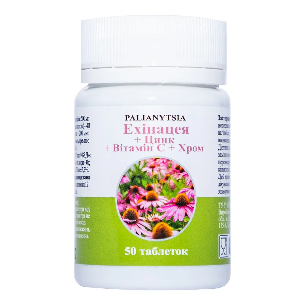 Диетическая добавка Palianytsia Эхинацея + цинк + витамин С – это мощный иммунный комплекс, объединяющий четыре активных компонента для всестороннего укрепления организма. Экстракт эхинацеи усиливает естественную защиту, в то время как витамин С действует как мощный антиоксидант. Цинк в составе поддерживает иммунную систему и здоровье кожи, а хром способствует нормализации уровня сахара в крови. Такое сочетание идеально подходит для поддержания иммунитета в сезон простуд и гриппа, а также в качестве натуральной комплексной помощи организму.