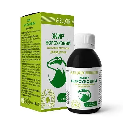 «Борсучий жир с витаминным комплексом» – ценный пищевой продукт. Он содержит более 86% ненасыщенных жирных кислот, необходимых для полноценной жизнедеятельности человеческого организма (Омега-3 и Омега-6), витамины А, В 2 , В 5 , В 6 , В 12 , D, РР, Е, каротин, фолиевая кислота, аминоти, органические кислоты.