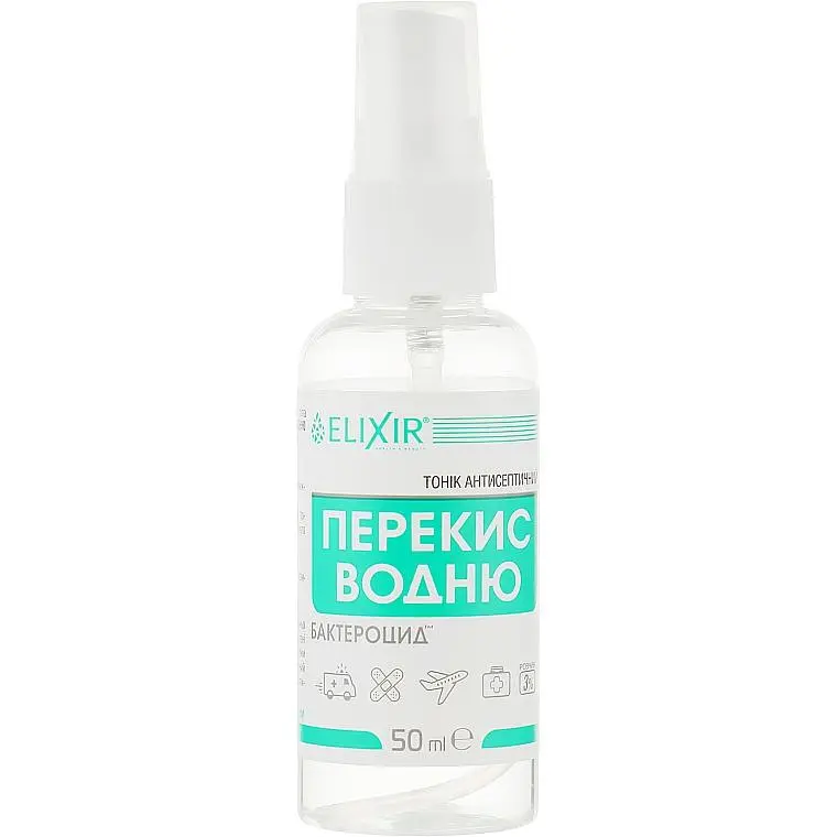 Антисептик для рук и тела Elixir Бактероцид - наружный антисептик, противомикробное и дезинфицирующее средство на основе перекиси водорода. Благодаря встроенному распылителю средство легко наносится и удобно транспортируется.