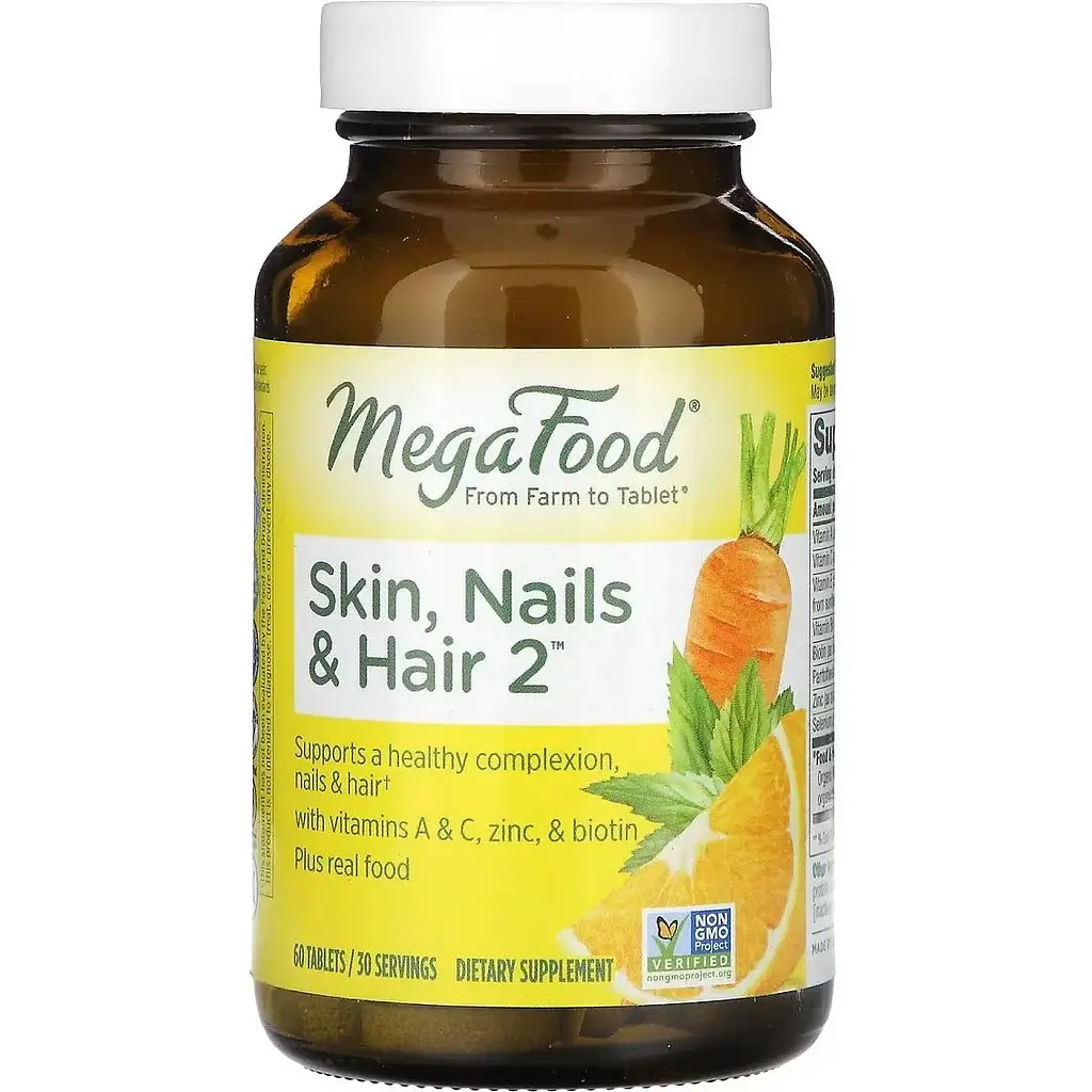 MegaFood Skin, Hair & Nails 2 - это специально разработанная формула, которая содержит FoodState Nutrients с травами, натуральными цельными продуктами и крапивой для укрепления и питания, она поддерживает вас изнутри.