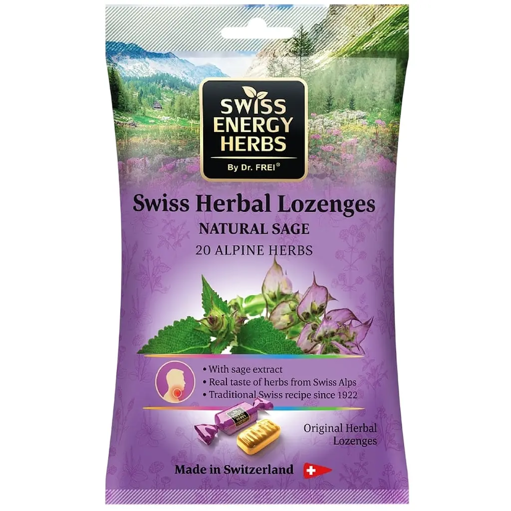 Леденцы от простуды Swiss Energy Herbal Lozenges Bag 20 herbs + Sage от кашля, боли в горле и заложенности носа 20 альпийских трав и шалфея – это натуральные леденцы для рассасывания, созданные по швейцарской рецептуре из 20 альп.