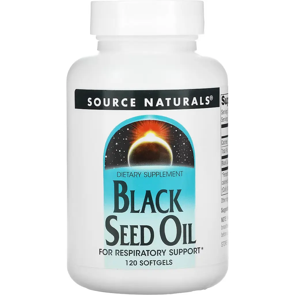 Source Naturals Black Cumin Seed Oil изготовлен из отборных семян тмина. Согласно предварительным результатам клинических исследований, масло из семян черного тмина способствует нормальной работе желудочно-кишечного тракта. Дополнительные клинические исследования показали, что масло из семян черного тмина в дозировке, имеющей эта добавка, способствует когнитивной функции и нормальной памяти. Масло полезно для дыхательной системы, как отхаркивающее, противовирусное и бактерицидное средство, применяется для лечения простудных заболеваний, бронхитов, пневмонии, кашля, боли в горле и т.д.