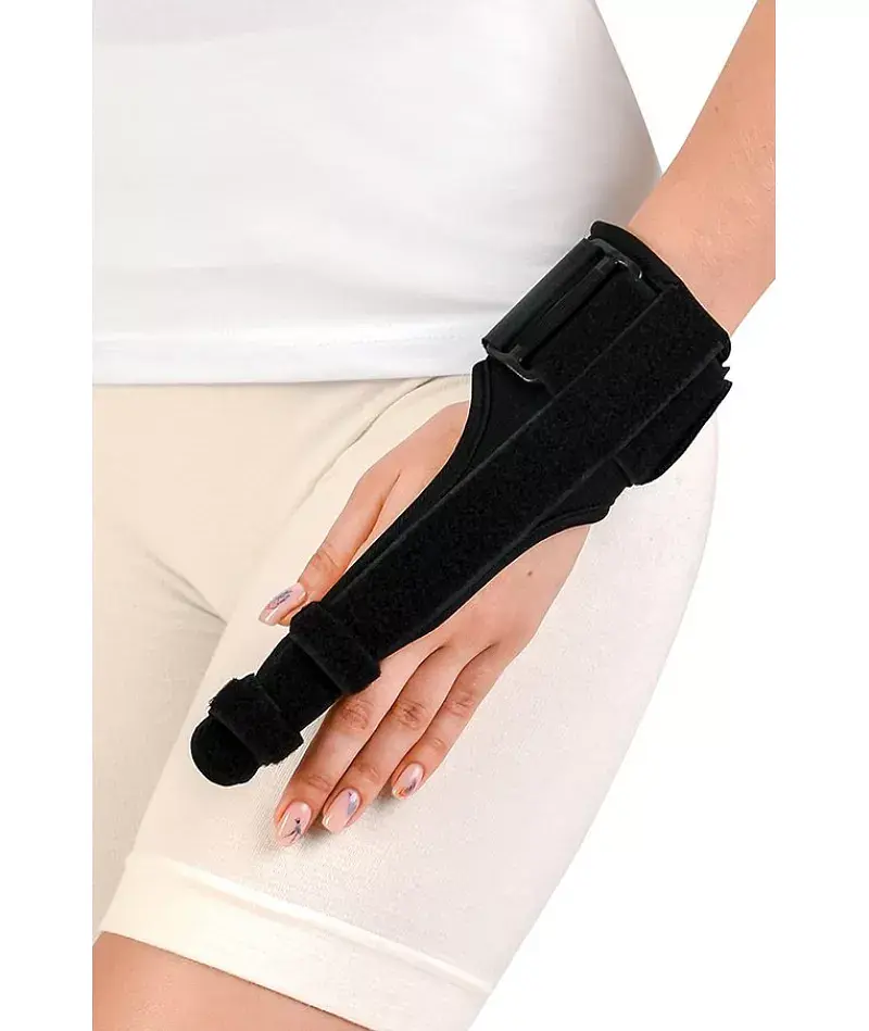 Модель крепится на запястье и может применяться в случае комбинированных травм конечности. Универсальный размер позволяет успешно использовать тот же ортез при выраженной отечности сустава, и позже, когда отек спадет и окружность запястья значительно уменьшится. Алюминиевое ребро жесткости надежно, как и гипсовая повязка, будет удерживать палец в заданном врачом положении. Фиксацию можно усилить с помощью дополнительных ремешков. Материал ортеза хорошо пропускает воздух и отводит влагу наружу, поэтому пользоваться этой моделью очень комфортно. Трикотажная отделка краев исключает натирку.