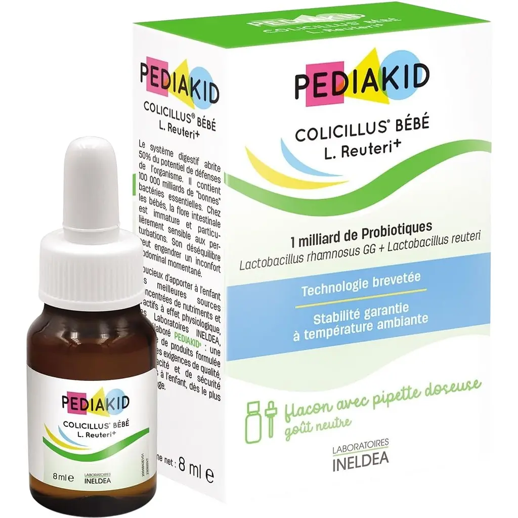 Капли против колик у младенцев Pediakid Colicillus Bebe L.Reuteri+ содержат 2 штамма специальных пробиотиков с гарантированным содержанием 1 миллиард живых лактоферментов в одной суточной дозе. Выбор именно этих штаммов пробиотиков основывается на многочисленных научных исследованиях в отношении младенцев. 1 миллиард пробиотиков в день помогает укрепить иммунитет ребенка и улучшить пищеварение.