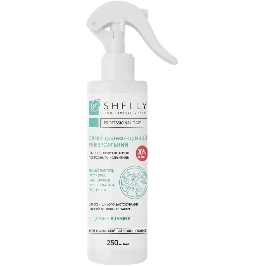 Готовый к использованию дезинфекционный раствор Shelly предназначен для гигиенической дезинфекции рук, кожи, поверхностей и инструментов. Подходит для использования в салонах ногтевого сервиса, салонах красоты, косметологических студиях, парикмахерских, а также в учреждениях здравоохранения всех профилей. Эффективное сочетание активных веществ в составе антисептика гарантирует широкий спектр действия: вирулицидное, бактерицидное, фунгицидное. Глицерин и витамин Е увлажняют кожу и предотвращают сухость и шелушение.