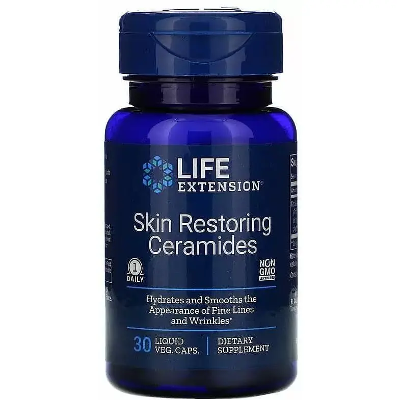 Life Extension Skin Restoring Ceramides - продукт, который улучшает состояние кожи изнутри, способствует ее гладкости издоровью. Он изготавливается с использованием ультрачистого пшеничного масла, богатого керамидами, что способствует сглаживанию проявлений морщин, увлажнению и оживлению кожи изнутри.