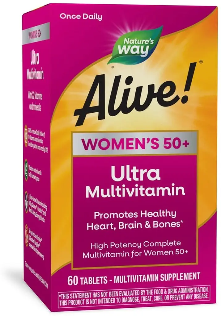 Nature's Way Alive! Once Daily Women’s 50+ Ultra Potency - ультрамощный ежедневный мультивитаминный комплекс, разработанным специально для женщин возрастом 50+. Он состоит из 100% или более дневной нормы 19 витаминов и минералов и 200% или более дневной нормы 10 витаминов и минералов, включая первоклассные витамины группы В для превращения пищи в топливо